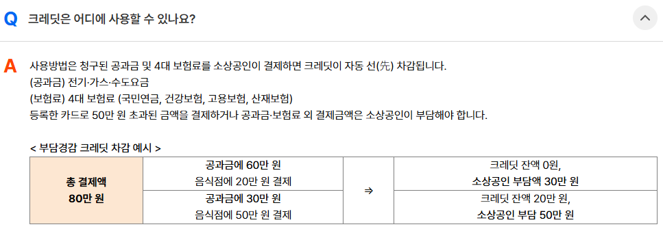 - 결제 방식: 등록된 카드로 전기, 수도, 가스요금 및 4대 보험료(국민연금·건강·고용·산재보험) 결제 시 자동으로 크레딧 차감