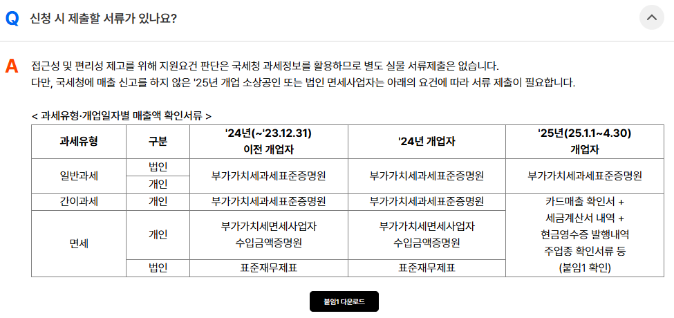 - 지원대상: 2025년 5월 1일 이전 개업, 연 매출 0~3억 원 이하의 현재 영업 중인 소상공인 (개인/법인/1인 사업자 포함)